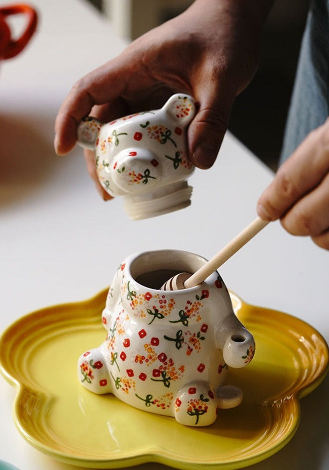 Easy to Use - Painted ceramic honey jar to store your honey and syrup. Easy to add honey to hot beverages or bread without dirtying more utensils and without making a sticky mess.
